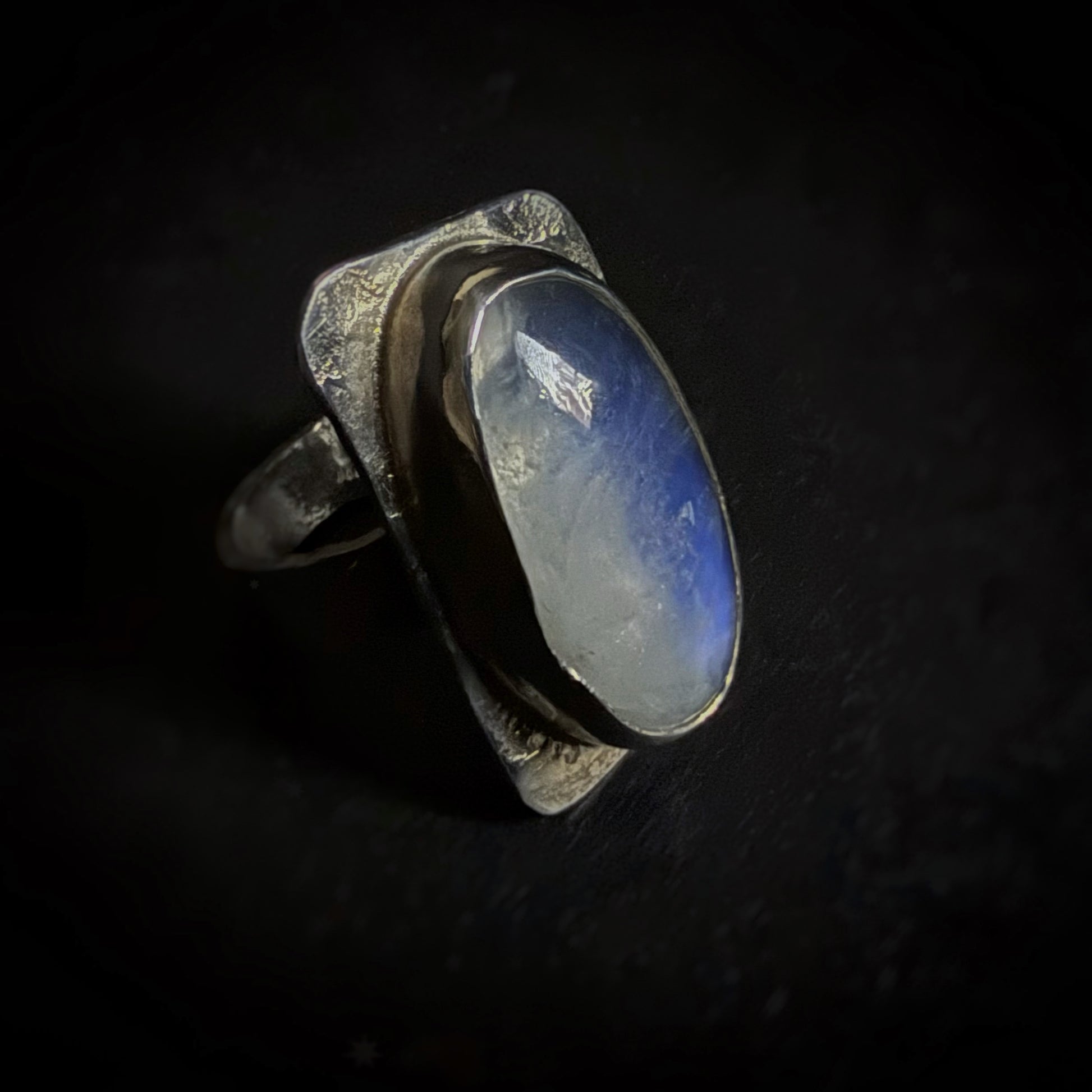 This shy Moonstone has a whisper of purple adularescence (“flash”) that disappeared when I set it on silver. So, to help it “pop” I set this semi-transparent stone over a piece of denim fabric. The purple “flash” and the dark navy denim blue combine to render a vibrant indigo hue.