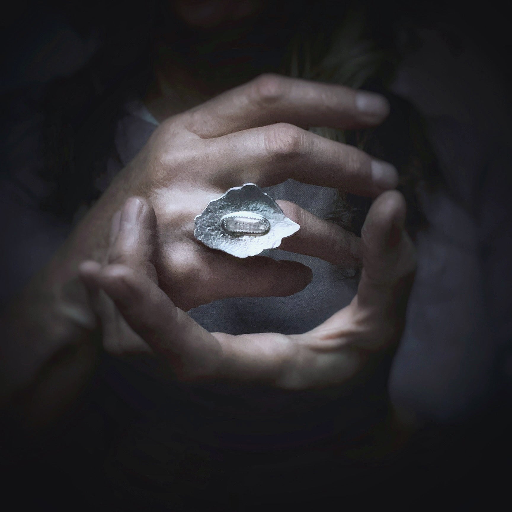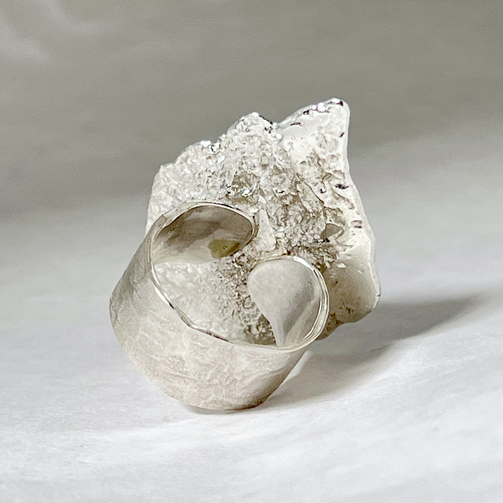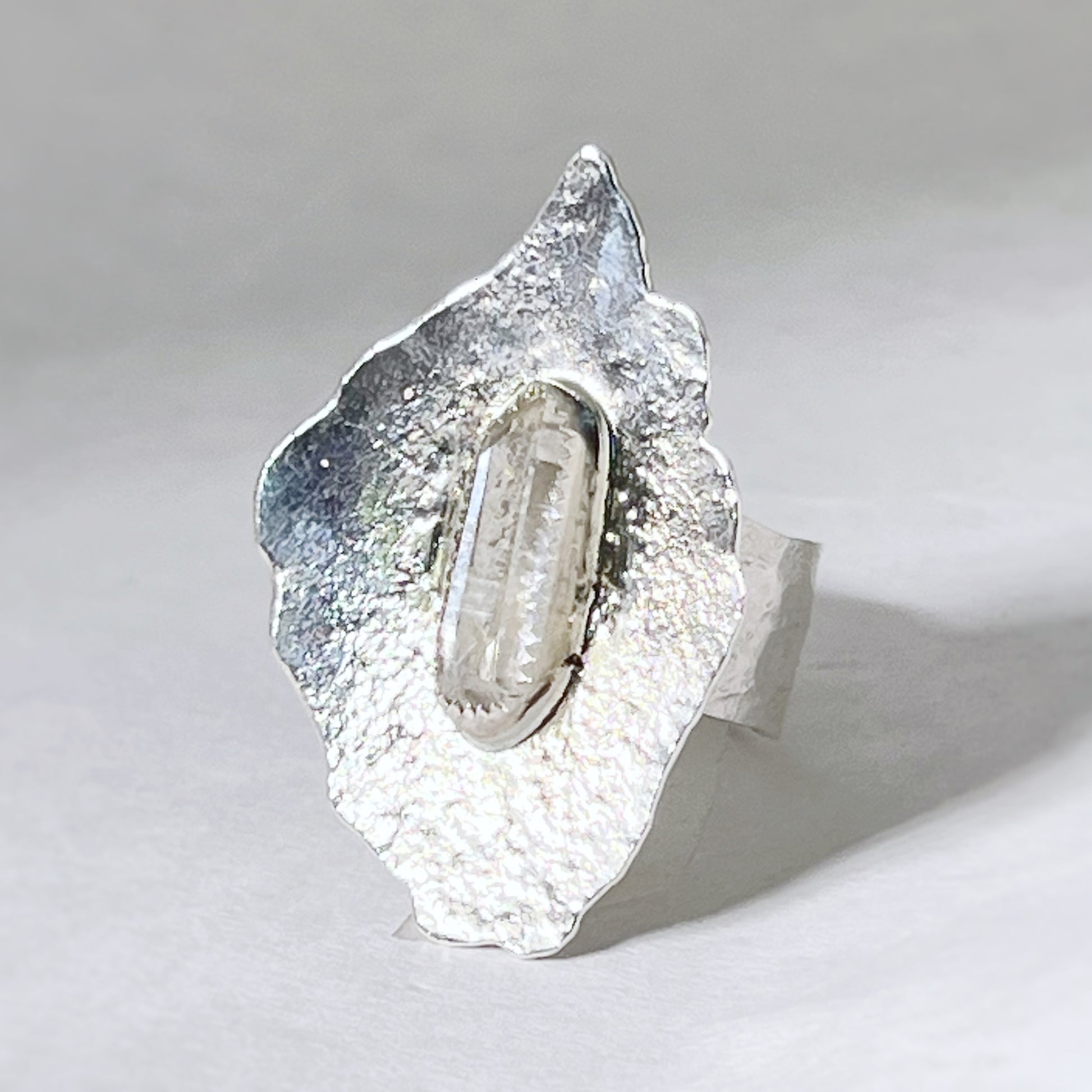 This beauty may seem delicate, but she brings the white heat. A little quartz crystal point nestled in serrated fine silver set on a delicate, flame-like recycled Sterling silver "molten formed" backplate and 11mm wide band.