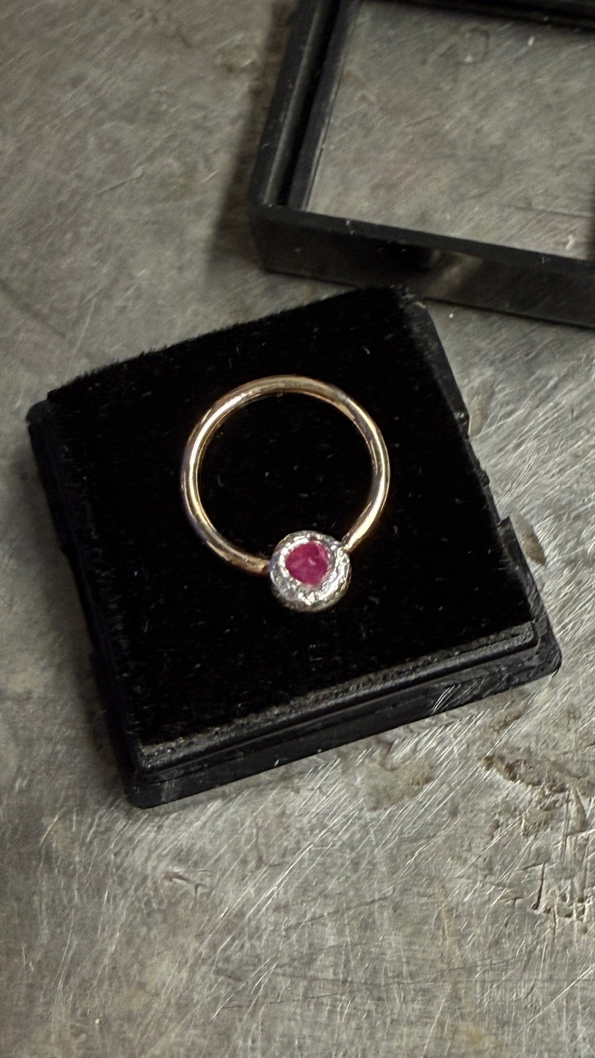 Mixed metal + ruby “seamless” style septum ring. The 10mm ring is solid 16g 14K yellow gold with a textured recycled Sterling silver end with a ruby set culet (that’s the pointy end) up.