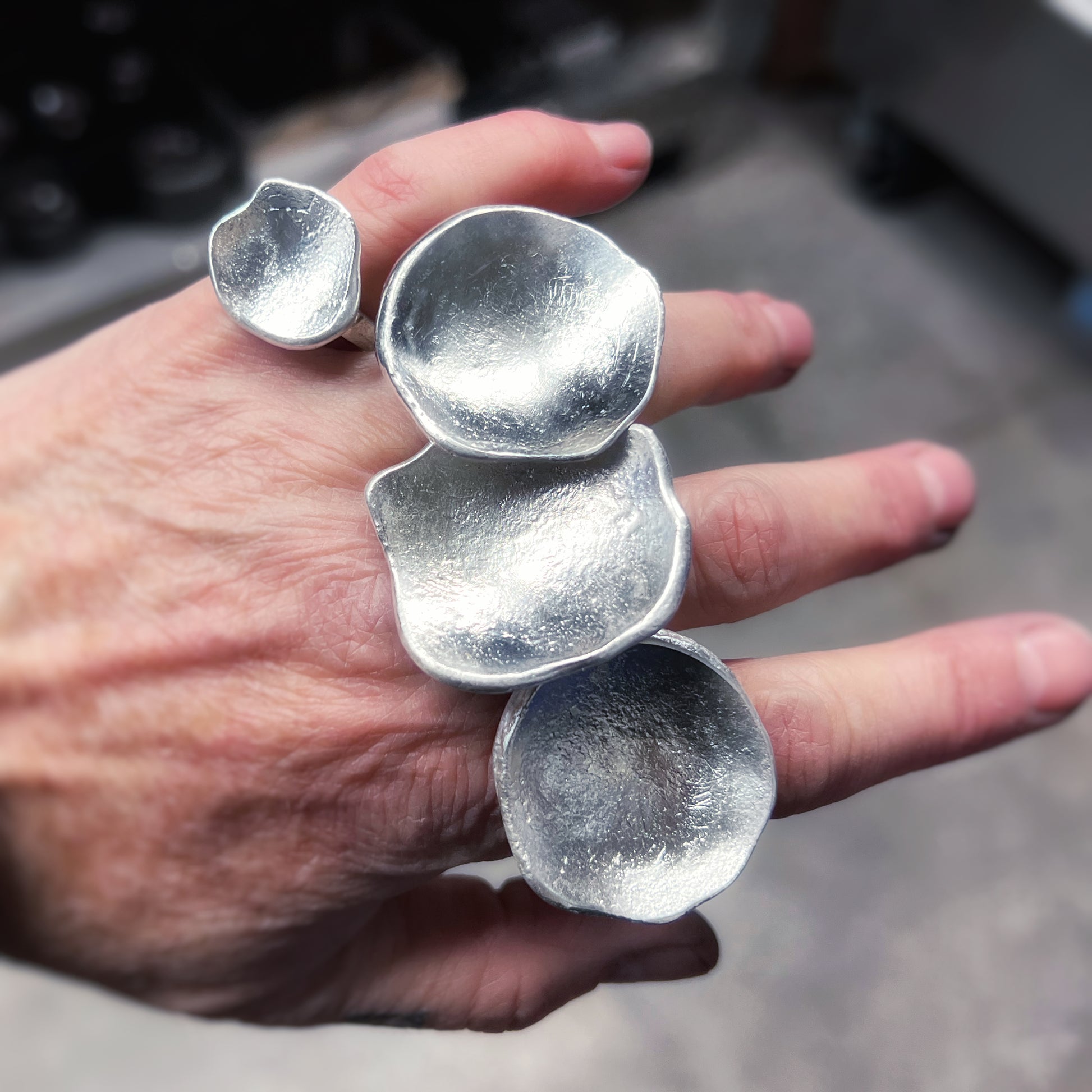 This "molten formed" recycled Sterling silver ring not only is a sleek, organic statement piece, it can also function as a fidget or "worry" ring!! It sits atop a rounded square sandcast band.